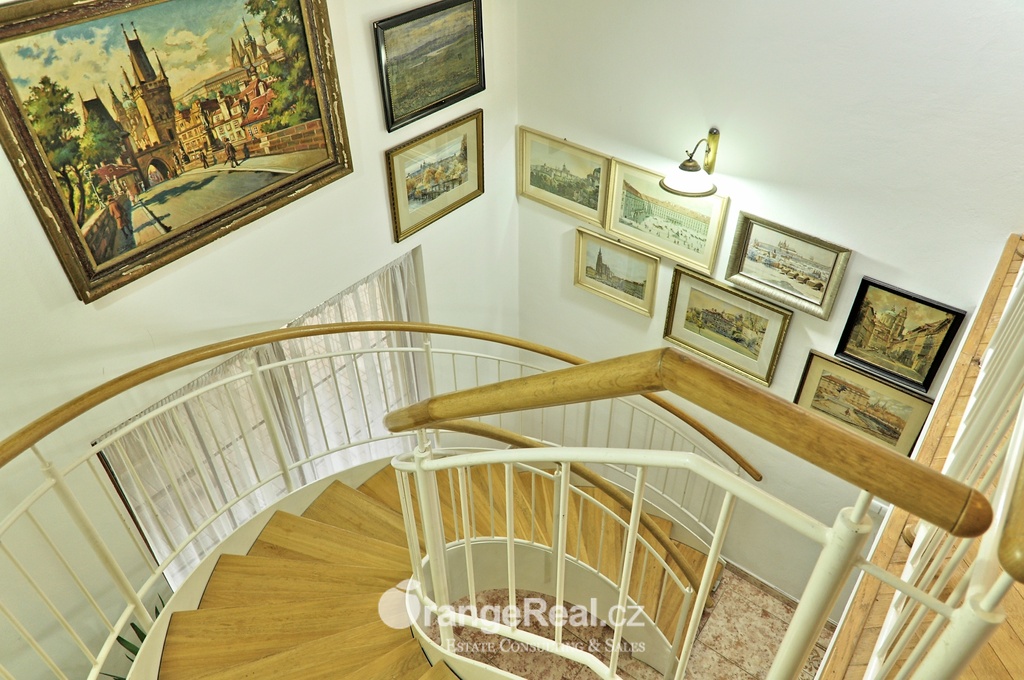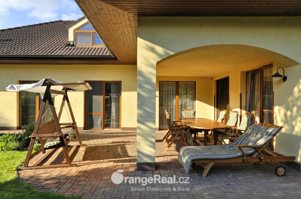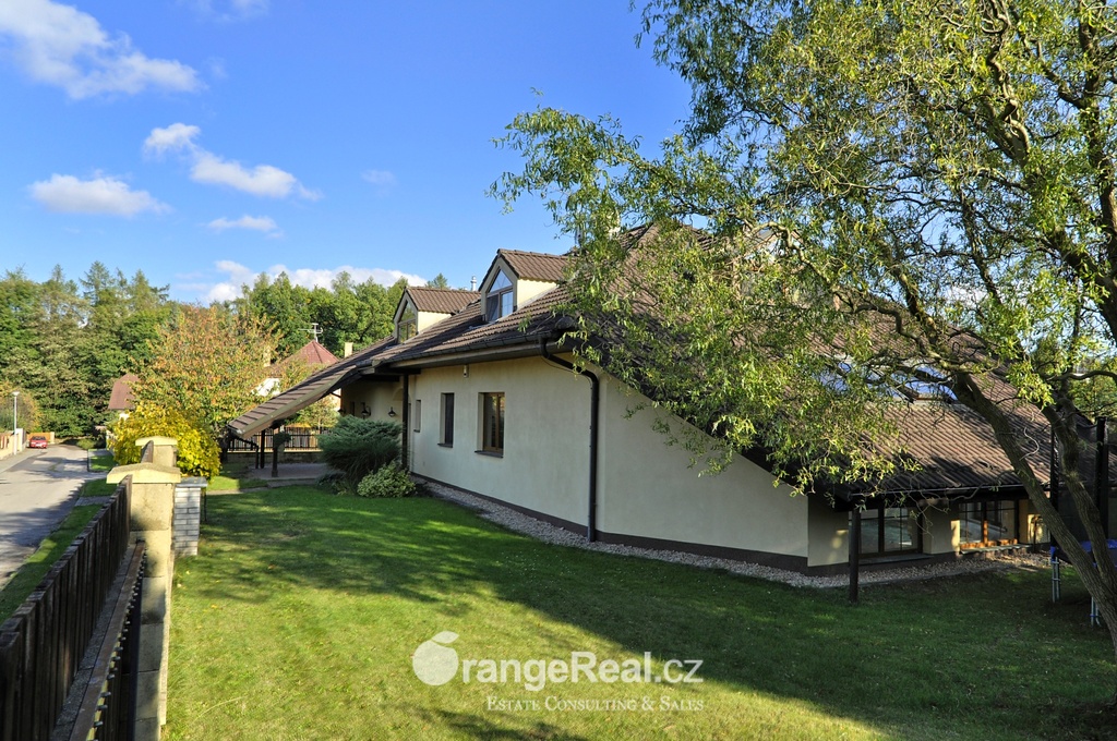 Výhradně nabízíme k prodeji krásný rodinný dům v lokalitě Jesenice - Horní Jirčany. Dispozičně 8+1, o užitné ploše 334m2 + bazén 32m2 a terasa 44m2. Dům se nachází na pozemku o výměře 1.111m2, v bonitní a vyhledávané lokalitě. Dům sestává v I. NP ze zádveří /dveřmi propojené s garáží/ navazující na prostornou halu, z které je v pravém křídle domu přístup do kuchyně s jídelním zázemím a obývacího pokoje se vstupem do realxační bazénové místnosti /bazén, sauna, sprcha/, prosklenými dveřmi a okny opticky propojené se zahradou. Bazén je celoročně uživatelný, vyhřívaný. Obývacímu prostoru dominuje krb s krbovou vložkou, z místnosti lze vstoupit na prostorově velkorysou terasu s krytou částí. Ze vstupní haly lze dále projít do levého křídla domu, kde nalezneme koupelnu s toaletou, ložnici, šatnu a pracovnu. Po točitém schodišti se vystoupá do II. NP, které sestává z haly, šatny, komory, dalších čtyřech obytných místností, technického zázemí domu, koupelny a samostatné toalety. Vytápění domu, bazénu a ohřev TUV zajišťují 2 plynové kondenzační kotle, v I. NP podlahové topení, ve II. NP radiátory. Dům se nachází v přírodní lokalitě, ovšem v blízkosti hlavního města Prahy. Doprava do ZŠ školní bus zajištěný obcí. 8min Canadian scholl, MŠ i anglická, ZUŠ, golfové hřiště. Obchodní možnosti v místě, dále OC Průhonice, Chodov. Doplňující informace u obchodníka společnosti. Doporučujeme navštívit virtuální prohlídku na web stránkách naší společnosti.