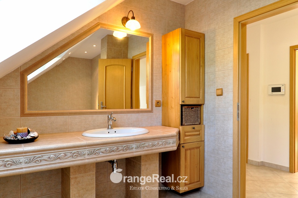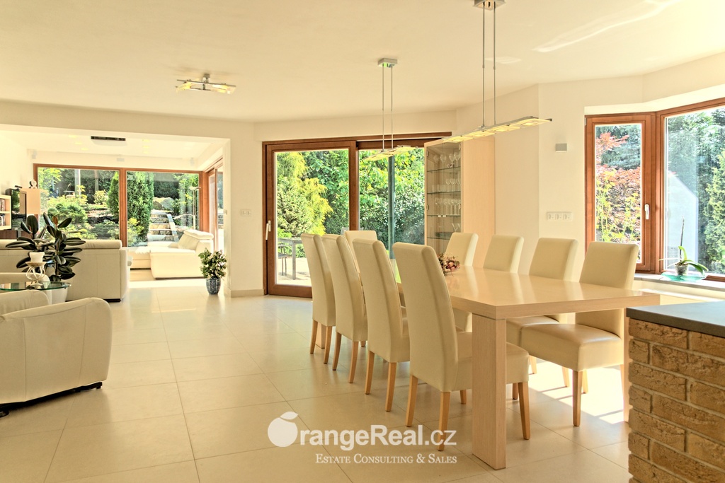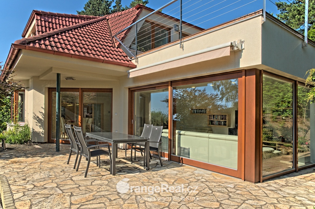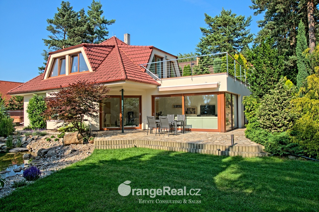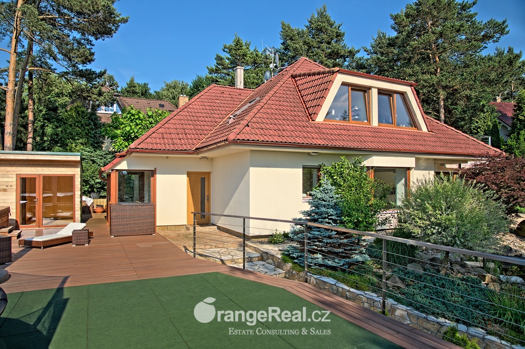 Výhradně nabízíme k prodeji luxusní rodinný dům - Tehov u Říčan, dispozičně 7+kk, o celkové obytné ploše 236m2 + garáž 71m2 + 2x terasa 46m2 a 120m2 + finská a bio-sauna s vířivkou, na pozemku o celkové rozloze 1.022m2. Dům je situován v okrajové části obce Tehov u Říčan, jenž se rozkládá v krásné přírodě, mezi hustými neporušenými lesy. Rodinný dům byl vystavěn v roce 2001 a v roce 2013 byl rekonstrukcí rozšířen a kompletně modernizován. Svému majiteli zajistí komfortní bydlení se splněním všech nároků současných trendů, v kombinaci pobytu v klidu krásné přírody v okolí domu - pečlivě udržovaná zahrada se vzrostlými stromy, okrasnými dřevinami, automatickou závlahou, koupacím jezírkem, letní kuchyní a dále terasami s posezením. Rodinný dům, architektonicky citlivě zasazen do terénního profilu, je koncipován kaskádovitě, v úrovni příjezdu je umístěna prostorově velkorysá garáž s krytým stáním a přímým vstupem do domu, obytná plocha, čítající dvě nadzemní patra byla vybudována v další úrovni terénu, díky tomu skýtá krásný výhled do okolní zeleně. I. NP - za vstupním zádveřím se nachází jídelní prostor, kuchyňské zázemí /kuch. linka SYKORA s vestavěnými spotřebiči AEG/ a centrální obytný prostor s krbovými kamny. Z jídelny a obývacího prostoru přímé výstupy na terasu a do zahradní části, která zaručuje ničím nerušený pobyt díky vzrostlým stromům. V tomto podlaží dále tři obytné místnosti a dvě koupelny s toaletou. II. NP – dva dětské pokoje, koupelna s toaletou, ložnice s vestavěnou skříní, ze všech místností přímý vstup na terasu. Dřevěná Eurookna chrání předokenní rolety na ele. pohon, podlahy kombinace lamina a keramické dlažby. Stavebním prvkem domu Porotherm, střecha KM Beta. Vytápění a ohřev teplé vody zajištuje plynový kotel s rozvody do radiátorů, podlahového vytápění a otopných žebříků v koupelnách. Veškeré inženýrské sítě jsou zavedeny do domu. V obci MŠ, ZŠ, obchod, kulturní zařízení. Další občanská vybavenost v obci Stránčice 3km, Říčany 6km, Praha 17km. Dopravní obslužnost MHD, ČD ve Stránčicích, Říčanech. Doplňující informace u obchodníka.