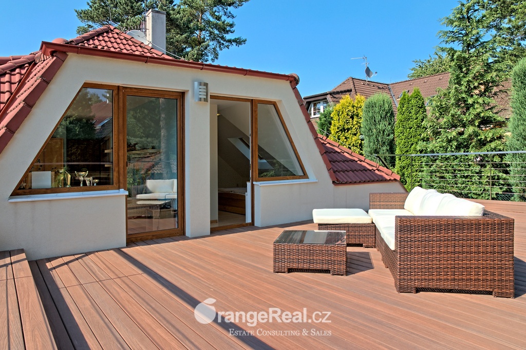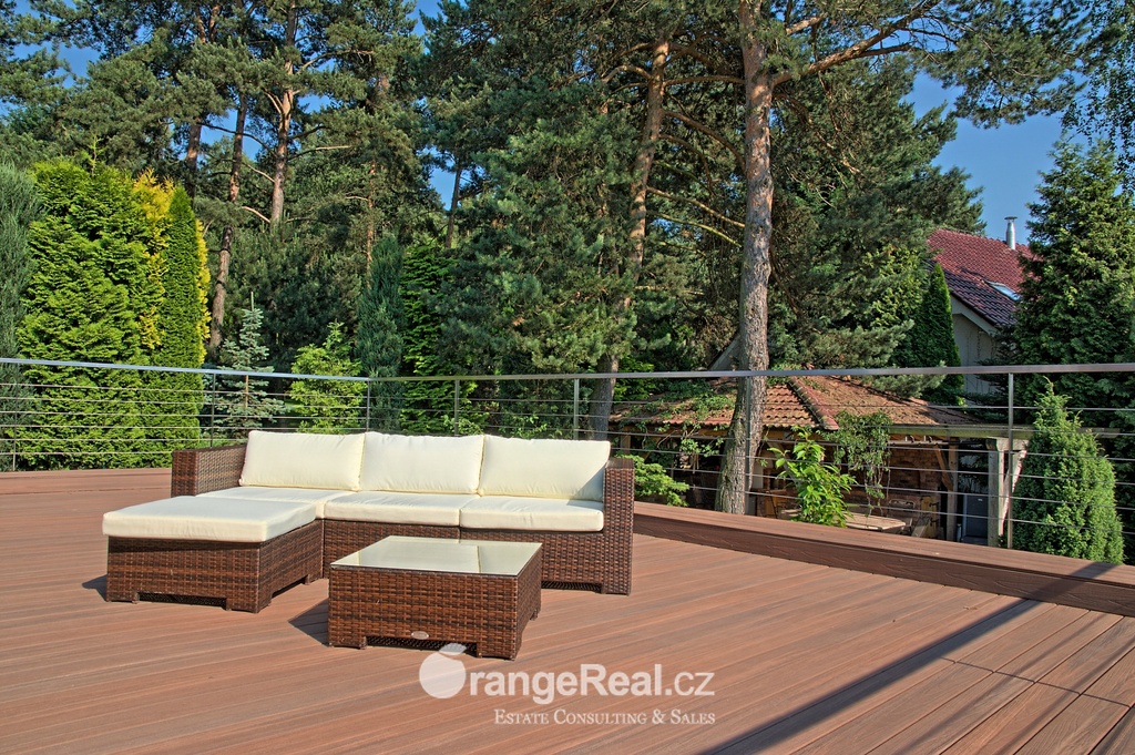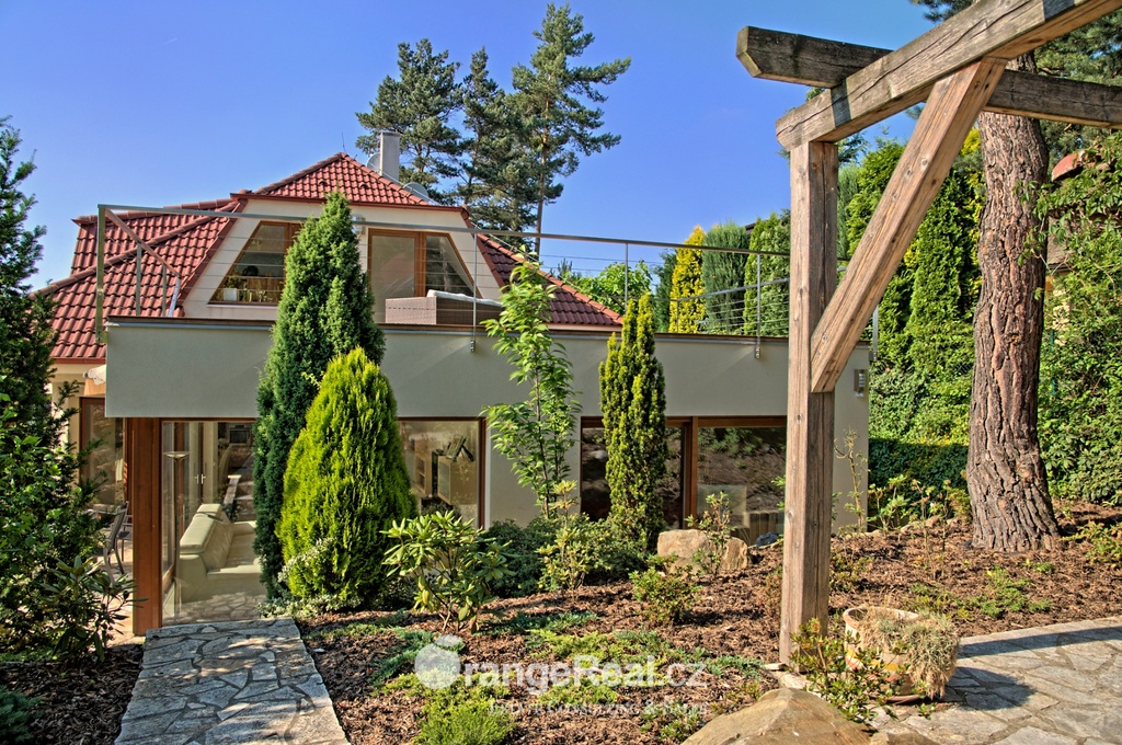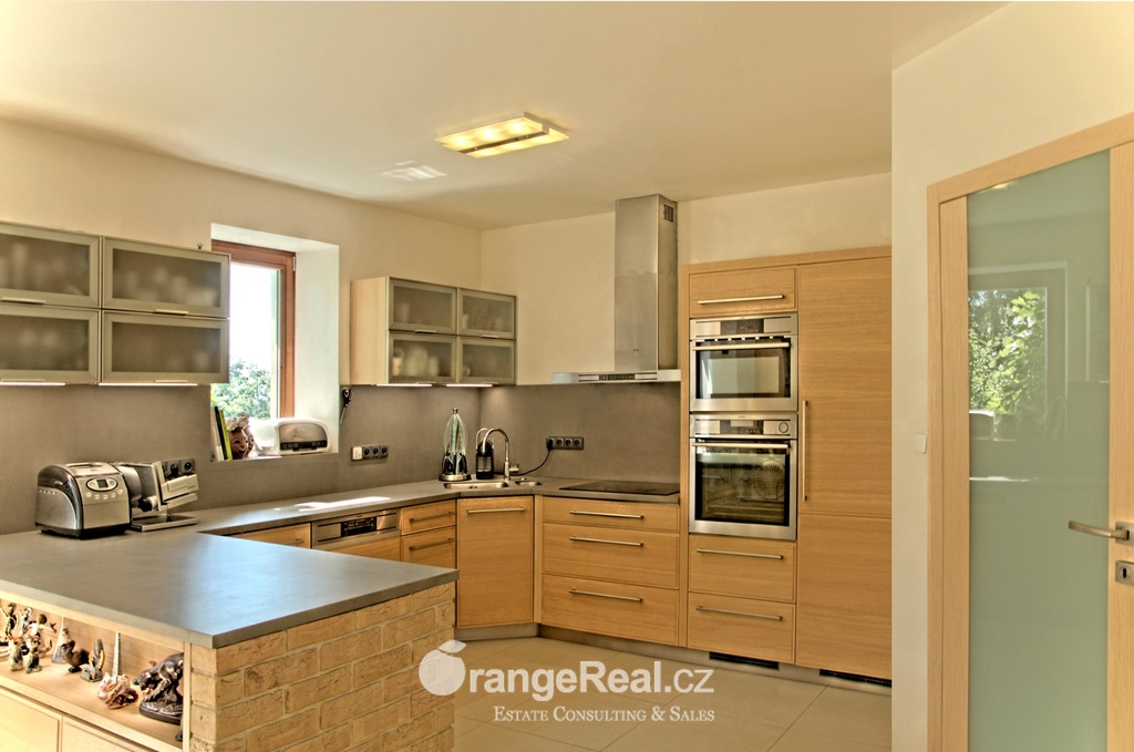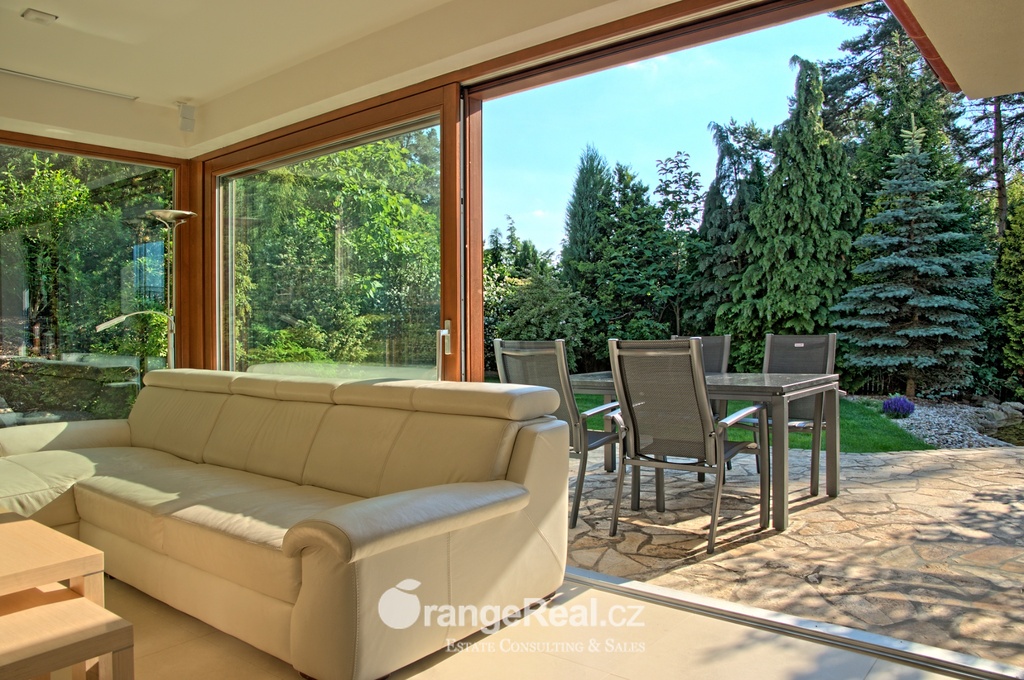 Výhradně nabízíme k prodeji luxusní rodinný dům - Tehov u Říčan, dispozičně 7+kk, o celkové obytné ploše 236m2 + garáž 71m2 + 2x terasa 46m2 a 120m2 + finská a bio-sauna s vířivkou, na pozemku o celkové rozloze 1.022m2. Dům je situován v okrajové části obce Tehov u Říčan, jenž se rozkládá v krásné přírodě, mezi hustými neporušenými lesy. Rodinný dům byl vystavěn v roce 2001 a v roce 2013 byl rekonstrukcí rozšířen a kompletně modernizován. Svému majiteli zajistí komfortní bydlení se splněním všech nároků současných trendů, v kombinaci pobytu v klidu krásné přírody v okolí domu - pečlivě udržovaná zahrada se vzrostlými stromy, okrasnými dřevinami, automatickou závlahou, koupacím jezírkem, letní kuchyní a dále terasami s posezením. Rodinný dům, architektonicky citlivě zasazen do terénního profilu, je koncipován kaskádovitě, v úrovni příjezdu je umístěna prostorově velkorysá garáž s krytým stáním a přímým vstupem do domu, obytná plocha, čítající dvě nadzemní patra byla vybudována v další úrovni terénu, díky tomu skýtá krásný výhled do okolní zeleně. I. NP - za vstupním zádveřím se nachází jídelní prostor, kuchyňské zázemí /kuch. linka SYKORA s vestavěnými spotřebiči AEG/ a centrální obytný prostor s krbovými kamny. Z jídelny a obývacího prostoru přímé výstupy na terasu a do zahradní části, která zaručuje ničím nerušený pobyt díky vzrostlým stromům. V tomto podlaží dále tři obytné místnosti a dvě koupelny s toaletou. II. NP – dva dětské pokoje, koupelna s toaletou, ložnice s vestavěnou skříní, ze všech místností přímý vstup na terasu. Dřevěná Eurookna chrání předokenní rolety na ele. pohon, podlahy kombinace lamina a keramické dlažby. Stavebním prvkem domu Porotherm, střecha KM Beta. Vytápění a ohřev teplé vody zajištuje plynový kotel s rozvody do radiátorů, podlahového vytápění a otopných žebříků v koupelnách. Veškeré inženýrské sítě jsou zavedeny do domu. V obci MŠ, ZŠ, obchod, kulturní zařízení. Další občanská vybavenost v obci Stránčice 3km, Říčany 6km, Praha 17km. Dopravní obslužnost MHD, ČD ve Stránčicích, Říčanech. Doplňující informace u obchodníka.