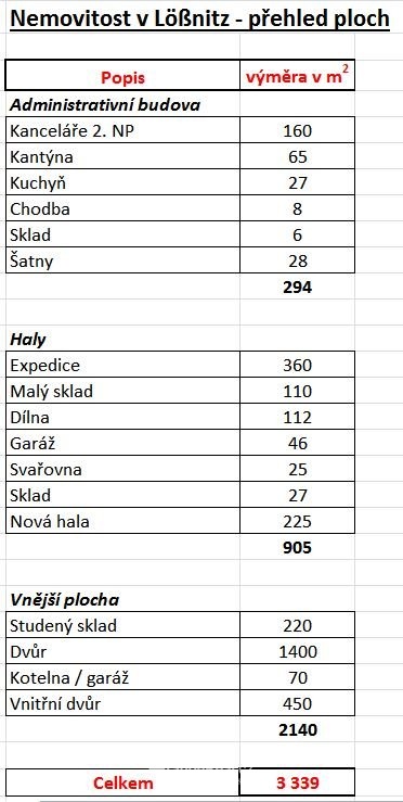 V zastoupení klienta nabízíme k prodeji bývalý výrobní a skladový areál v obci Lößnitz, Johannisstraße 66, 08294, Německo (výroba byla v průběhu roku 2016 zastavena). Areál má ideální dopravní polohu, neboť se nachází cca 5 km od dálnice A4/A72, 22km od Chemnitz, 66km od Chomutova (1h 14min autem) a 163km od Prahy. Areál má rozlohu 8.658 m2, výrobní a skladové prostory zabírají 3.339m. K dispozici je kompletní kancelářské a sociální zázemí. Dvoulodní hala byla kolaudována v roce 2002, zbytek objektu pochází ze 70. let minulého století. Areál zahrnuje pozemky p. č. 661/5, 661/9, 661/12.